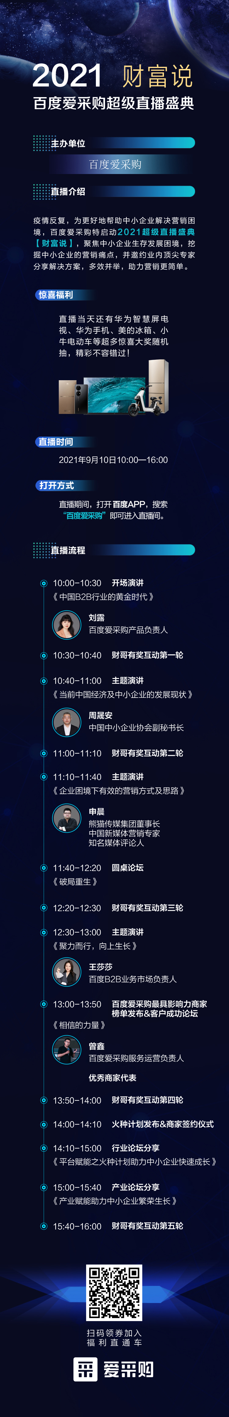2021#百度愛采購# 超級直播盛典#財富說# 即將盛大開啟!2021#百度愛采購# 超級直播盛典#財富說# 即將盛大開啟! 挖掘企業經營痛點, 聚焦企業生存困境, 并邀約眾多行業知名大咖現場分享解決方案,助力中小企業點亮營銷指明燈。 9月10日,打開百度APP, 我們不見不散!