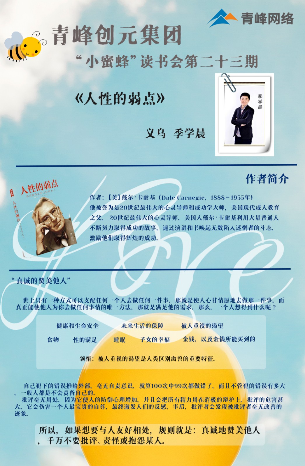 【青峰創元集團】“小蜜蜂”讀書會第23期《人性的弱點》-- 季學晨分享