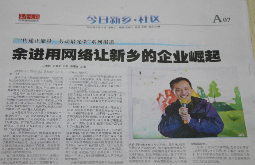 五月十五日,新鄉《平原晚報》,發表了新鄉市“五一”勞動獎章獲得者:河南青峰網絡科技有限公司總經理余進的專訪文章:余進用網絡讓新鄉企業崛起。