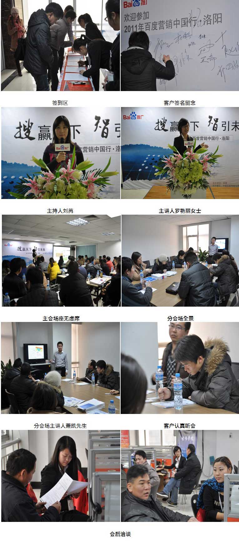 2011年12月21日“搜贏天下 智引未來百度營銷中國行”洛陽站在洛陽市青峰網(wǎng)絡(luò)科技有限公司會議室“青玉案”隆重舉行。通過會議講解使客戶清晰了解百度搜索推廣產(chǎn)品是如何獲取大量精準(zhǔn)商機(jī)的,從而促使客戶消除疑慮,加大搜索引擎營銷推廣力度,正視網(wǎng)絡(luò)營銷投放效果產(chǎn)出,推動客戶使用搜索引擎營銷方式進(jìn)一步成熟。用實際案例突顯搜索推廣營銷為企業(yè)客戶帶來的實際效果,影響潛在客戶的市場營銷方式。