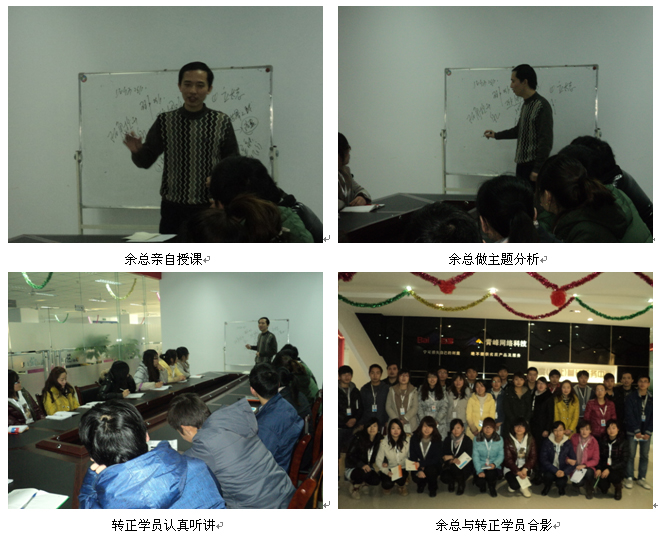 2011年12月17日上午10點,新鄉青峰網絡第三期轉正培訓如期舉行,青峰網絡總經理余進先生親自為轉正的新人做培訓,所有參訓人員備受鼓舞。