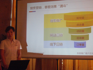 2010年7月21日,新鄉市青峰網絡科技有限公司:百度實效客戶培訓會議——“網絡產品效果評估”在沁園茶樓成功舉行??蛻粼诂F場積極提問,仔細分析,認真記錄,可以看得出目前互聯網效果評估對企業的重要性,也表明了網絡對于企業發展的重要程度?,F場通過精彩紛呈的講演和優秀的案例分析,向客戶講解如何對網絡產品進行有效的效果評估,避免在互聯網中出現的誤區,讓大家做一個明白的消費者。